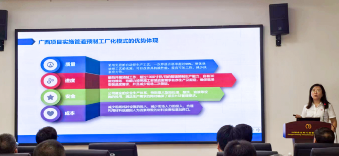 金童裝備公司常務副總兼總工程師韓越女士作“管道預制智能制造示范項目”的介紹及實施經驗分享。管道預制工廠化模式是工廠化預制的延伸,預制工廠化實施的主體是專業化的制造廠,質量控制體系與檢試驗設備、機械化作業與信息化管理等完全按照設備制造廠的模式實施,確保了產品質量的可控性和可追溯性;預制工廠的廠房、專業化設備、專業化人員等相對是穩定并且是共享型的,為整個市場服務,不是針對某個項目,可有效的降低項目建設臨時設施的投入;多個項目同步實施可大比例的提高原材料利用率,同時庫存材料可解決項目建設及后續運行維護過程緊急用料的需求,有效的為管道系統長周期穩定運行提供保障;標準化預制工作流程有利于加快施工進度、縮短建設周期、提高管道建設的效率和質量;管道預制工廠化模式是管道預制件的商品化供應的基礎,其獨有的專業性、穩定性、經濟性、共享性,決定管道預制工廠化可以為管道項目建設提供最為優良的解決方案。
