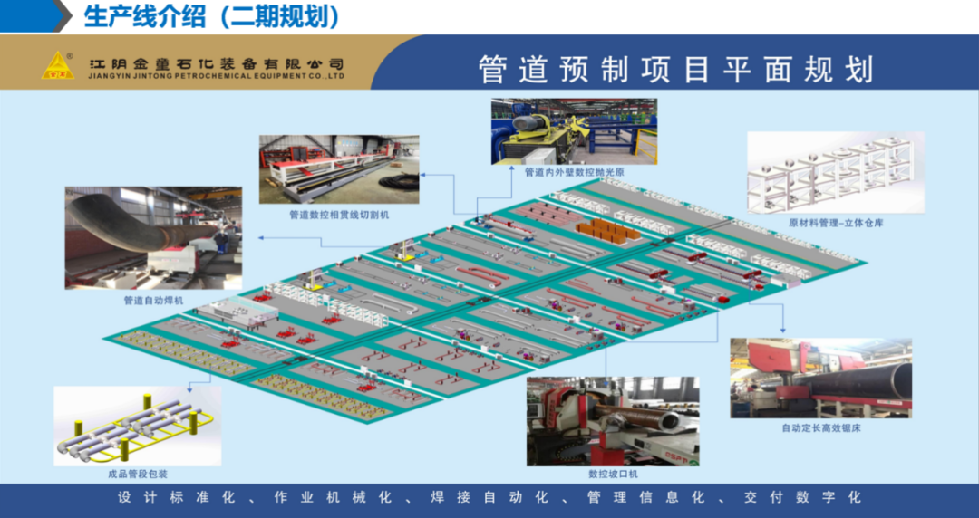 作為管道預制工廠化的實施主體之一,金童裝備公司三年前進行了戰略布局,相繼投入4億元,規劃建設了占地面積近40000㎡的智能制造示范性工廠,并計劃于2024年底全面建成,屆時集設計標準化、采購集約化、作業機械化、焊接自動化、管理信息化、交付數字化的先進管道預制智能制造項目將全面投用。在未來的工作中,金童裝備公司將繼續秉承“質量第一、安全至上、創新驅動、綠色發展”的理念,以本次中期驗收為契機,進一步總結經驗、查找不足、明確方向、制定措施,繼續深化“六化”建設在管道預制工廠化領域的應用與研究,努力推動課題工作再上新臺階、再創新佳績,不斷提升管道預制工廠化的水平,努力打造成為行業內的標桿企業。